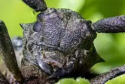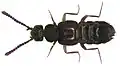 Beetle antennae are primarily organs of sensory perception and can detect motion, odor and chemical substances,[66] but may also be used to physically feel a beetle's environment. Beetle families may use antennae in different ways. For example, when moving quickly, tiger beetles may not be able to see very well and instead hold their antennae rigidly in front of them in order to avoid obstacles.[67] Certain Cerambycidae use antennae to balance, and blister beetles may use them for grasping. Some aquatic beetle species may use antennae for gathering air and passing it under the body whilst submerged. Equally, some families use antennae during mating, and a few species use them for defense. In the cerambycid Onychocerus albitarsis, the antennae have venom injecting structures used in defense, which is unique among arthropods.[68] Antennae vary greatly in form, sometimes between the sexes, but are often similar within any given family. Antennae may be clubbed, threadlike, angled, shaped like a string of beads, comb-like (either on one side or both, bipectinate), or toothed. The physical variation of antennae is important for the identification of many beetle groups. The Curculionidae have elbowed or geniculate antennae. Feather like flabellate antennae are a restricted form found in the Rhipiceridae and a few other families. The Silphidae have a capitate antennae with a spherical head at the tip. The Scarabaeidae typically have lamellate antennae with the terminal segments extended into long flat structures stacked together. The Carabidae typically have thread-like antennae. The antennae arises between the eye and the mandibles and in the Tenebrionidae, the antennae rise in front of a notch that breaks the usually circular outline of the compound eye. They are segmented and usually consist of 11 parts, the first part is called the scape and the second part is the pedicel. The other segments are jointly called the flagellum.[66][69][70]