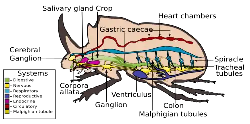 The digestive system of beetles is primarily adapted for a herbivorous diet. Digestion takes place mostly in the anterior midgut, although in predatory groups like the Carabidae, most digestion occurs in the crop by means of midgut enzymes. In the Elateridae, the larvae are liquid feeders that extraorally digest their food by secreting enzymes.[8] The alimentary canal basically consists of a short, narrow pharynx, a widened expansion, the crop, and a poorly developed gizzard. This is followed by the midgut, that varies in dimensions between species, with a large amount of cecum, and the hindgut, with varying lengths. There are typically four to six Malpighian tubules.[7]