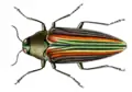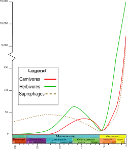 During the Jurassic (210 to 145 mya), there was a dramatic increase in the diversity of beetle families,[29] including the development and growth of carnivorous and herbivorous species. The Chrysomeloidea diversified around the same time, feeding on a wide array of plant hosts from cycads and conifers to angiosperms.[32] Close to the Upper Jurassic, the Cupedidae decreased, but the diversity of the early plant-eating species increased. Most recent plant-eating beetles feed on flowering plants or angiosperms, whose success contributed to a doubling of plant-eating species during the Middle Jurassic. However, the increase of the number of beetle families during the Cretaceous does not correlate with the increase of the number of angiosperm species.[33] Around the same time, numerous primitive weevils (e.g. Curculionoidea) and click beetles (e.g. Elateroidea) appeared. The first jewel beetles (e.g. Buprestidae) are present, but they remained rare until the Cretaceous.[34][35][36]