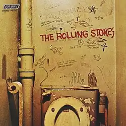 According to Keith Richards, the album's title was thought up by British art dealer Christopher Gibbs.[15] The album's original front and back cover art, photographs by Barry Feinstein depicting a bathroom wall covered with graffiti, was rejected by the band's record company,[16][17] which delayed the album's release for months.[6] Feinstein's photographs were later featured though on most vinyl, compact disc and cassette tape reissues of the album.[6][18] On 7 June 1968, a photoshoot for the album's gatefold, with photographer Michael Joseph, was held at Sarum Chase, a mansion in Hampstead, London.[19] Previously unseen images from the shoot were exhibited at the Blink Gallery in London in November and December 2008.[20]