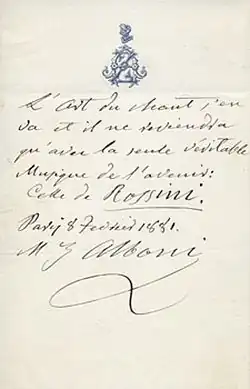 One reason for the eclipse of the old Italian singing model was the growing influence within the music world of bel canto's detractors, who considered it to be outmoded and condemned it as vocalization devoid of content. To others, however, bel canto became the vanished art of elegant, refined, sweet-toned musical utterance. Rossini lamented in a conversation that took place in Paris in 1858 that: "Alas for us, we have lost our bel canto".[14] Similarly, the so-called German style was as derided as much as it was heralded. In the introduction to a collection of songs by Italian masters published in 1887 in Berlin under the title Il bel canto, Franz Sieber wrote: "In our time, when the most offensive shrieking under the extenuating device of 'dramatic singing' has spread everywhere, when the ignorant masses appear much more interested in how loud rather than how beautiful the singing is, a collection of songs will perhaps be welcome which – as the title purports – may assist in restoring bel canto to its rightful place."[12]