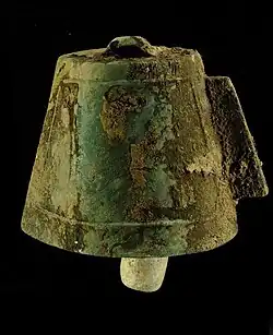 The earliest archaeological evidence of bells dates from the 3rd millennium BCE, and is traced to the Yangshao culture of Neolithic China.[6] Clapper-bells made of pottery have been found in several archaeological sites.[7] The pottery bells later developed into metal bells. In West Asia, the first bells appear in 1000 BCE.[6] The earliest metal bells, with one found in the Taosi site and four in the Erlitou site, are dated to about 2000 BCE.[8] With the emergence of other kinds of bells during the Shang dynasty (c. 1600 – c. 1050 BCE), they were relegated to subservient functions; at Shang and Zhou sites, they are also found as part of the horse-and-chariot gear and as collar-bells of dogs.[9] By the 13th century BCE, bells weighing over 150 kilograms (330 pounds) were being cast in China. After 1000 CE, iron became the most commonly used metal for bells instead of bronze. The earliest dated iron bell was manufactured in 1079, found in Hubei Province.[10]