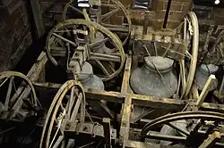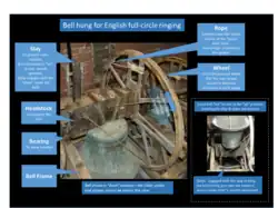 Bells hung for full circle ringing are swung through just over a complete circle from mouth uppermost. A stay (the wooden pole seen sticking up when the bells are down) engages a mechanism to allow the bell to rest just past its balance point. The rope is attached to one side of a wheel so that a different amount of rope is wound on and off as it swings to and fro. The bells are controlled by ringers (one to a bell) in a chamber below, who rotate the bell through a full circle and back, and control the speed of oscillation when the bell is mouth upwards at the balance-point when little effort is required.