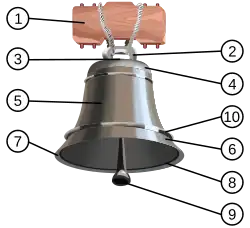 ![]() Parts of a typical tower bell hung for swinging: 1. Bell yoke or headstock, 2. canons, 3. crown, 4. shoulder, 5. waist, 6. sound bow, 7. lip, 8. mouth, 9. clapper, 10. bead line | |