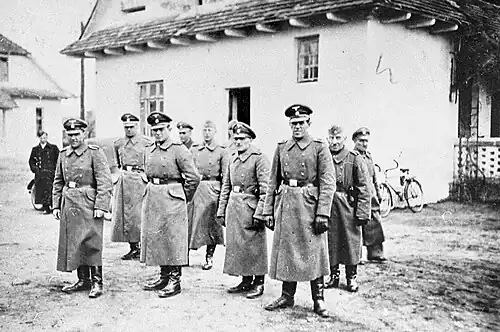 Belzec camp guards included German Volksdeutsche and up to 120 former Soviet prisoners of war (mostly Ukrainians) organised into four platoons.[5][27] Following Operation Barbarossa, all of them underwent special training at the Trawniki SS camp division before they were posted as "Hiwis" (German abbreviation for Hilfswilligen, lit. "those willing to help") in the concentration camps as guards and gas chamber operators.[36] They provided the bulk of Wachmänner collaborators in all major killing sites of the Final Solution.[37][38]