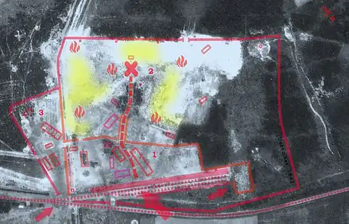 Aerial photograph of Bełżec camp perimeter taken in 1944 by the Luftwaffe (a common practice with murder factories after clean-up, making sure that it is safe to abandon). Known structures are gone except for the brick-and-mortar garage and auto-shop for the SS, whose foundations still exist today (lower left). Across the fence (left), separated from the main camp, the Hiwi guards' accommodations with kitchen as well as sorting and packing yard for victims possessions. Dismantled barracks can still be seen surrounded by walking sand. The railway unloading platform, with two parallel ramps, marked with red arrow. A smaller arrow shows the holding pen for Jews still waiting to be "processed". Location of gas chambers marked with a cross. Undressing and hair-cropping area marked with rectangle, with fenced-out "Sluice" into the woods, obstructing the view of the surroundings. Cremation pyres and ash pits (yellow), upper half.