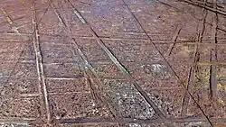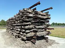 Portion of the memorial in Bełżec. Cemented rails built in place of the original unloading ramp, lead in all directions from which the Jews were brought in.[47]