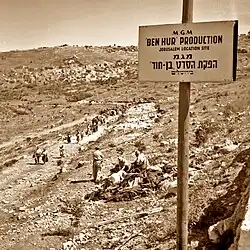 Pre-production began at Cinecittà Studios around October 1957.[23] The MGM Art Department produced more than 15,000 sketches and drawings of costumes, sets, props, and other items needed for the film (8,000 alone for the costumes); photostatted each item; and cross-referenced and catalogued them for use by the production design team and fabricators.[91] More than a million props were ultimately manufactured.[92] Construction of miniatures for the entrance of Quintus Arrius into Rome and for the sea battle were underway by the end of November 1957.[1] MGM location scouts arrived in Rome to identify shooting locations in August 1957.[93] Location shooting in Africa was actively under consideration, and in mid-January 1958, MGM said that filming in North Africa (later revealed to be Libya) would begin on March 1, 1958, and that 200 camels and 2,500 horses had already been procured for the studio's use there.[94] The production was then scheduled to move to Rome on April 1, where Andrew Marton had been hired as second unit director and 72 horses were being trained for the chariot race sequence.[94] However, the Libyan government canceled the production's film permit for religious reasons on March 11, 1958, just a week before filming was to have begun.[m][95][1] It is unclear whether any second unit filming took place in Israel. A June 8, 1958, report in The New York Times said second unit director Andrew Marton had roamed "up and down the countryside" filming footage.[96] However, the American Film Institute claims the filming permit was revoked in Israel for religious reasons as well (although when is not clear), and no footage from the planned location shooting near Jerusalem appeared in the film.[1]