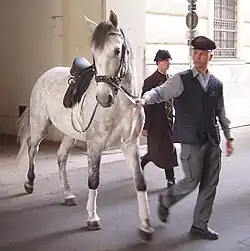 The Ben-Hur production utilized 300 sets scattered over 148 acres (60 ha) and nine sound stages.[105] Several sets still standing from Quo Vadis in 1951 were refurbished and used for Ben-Hur.[105] By the end of the production more than 1,000,000 pounds (450,000 kg) of plaster and 40,000 cubic feet (1,100 m3) of lumber were used.[57][106] The budget called for more than 100,000 costumes and 1,000 suits of armor to be made, for the hiring of 10,000 extras, and the procurement of hundreds of camels, donkeys, horses, and sheep.[24][54] Costume designer Elizabeth Haffenden oversaw a staff of 100 wardrobe fabricators who began manufacturing the costumes for the film a year before filming began. Special silk was imported from Thailand, the armor manufactured in West Germany, and the woolens made and embroidered in the United Kingdom and various countries of South America. Many leather goods were hand-tooled in the United Kingdom as well, while Italian shoemakers manufactured the boots and shoes. The lace for costumes came from France, while costume jewelry was purchased in Switzerland.[107] More than 400 pounds (180 kg) of hair were donated by women in the Piedmont region of Italy to make wigs and beards for the production,[108] and 1,000 feet (300 m) of track laid down for the camera dollies.[57] A workshop employing 200 artists and workmen provided the hundreds of friezes and statues needed.[54] The mountain village of Arcinazzo Romano,[108] 40 miles (64 km) from Rome, served as a stand-in for the town of Nazareth.[51] Beaches near Anzio were also used,[92] and caves just south of the city served as the leper colony.[100] Some additional desert panoramas were shot in Arizona, and some close-up inserts taken at the MGM Studios, with the final images photographed on February 3, 1958.[97]
