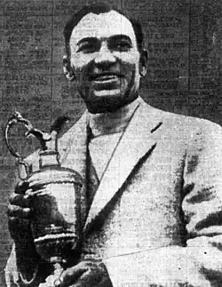In the final round at Carnoustie, Hogan chipped in from 40 feet (12 m) for birdie on the 5th hole, then made another birdie at the par-5 6th.[131] Hogan was notified he had a two-stroke lead while on the 15th hole, and after hitting his approach to 12 feet (3.7 m) on the 235-yard (215 m) par-3 16th, he told reporter John Derr: "This tournament's over. You can go in now and set up for the broadcast."[131] Hogan finished with a birdie on the 18th hole to shoot a course-record 68 and claim the Claret Jug, totaling 6-under 282 to win by four strokes over Antonio Cerdá, Dai Rees, Frank Stranahan, and Peter Thomson.[132] This made him the second golfer after Gene Sarazen to complete the modern career grand slam, and the first to win the Triple Crown. As well as the "Triple Crown", the press dubbed it the "Hogan Slam" and compared it to Bobby Jones's 1930 season.[118][133] For this win, Hogan received £500 (equivalent to $17,634 in 2023).[134]