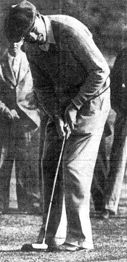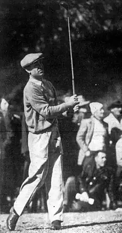 Once he turned 16 and reached the age-limit for caddying, Hogan began working in Glen Garden's golf shop, where he repaired and polished clubs. He recalled of this time: "Boy, I'd look at those clubs and they were the most beautiful things, Nichols and Stewarts, all made in Scotland. I got my own set of mongrel clubs out of a dime store barrel for a dollar a piece."[13] As he was no longer a caddie and had not received membership, Hogan was not allowed to practice at Glen Garden. He instead practiced at the nearest public course, Katy Lake.[6] In September 1928, Hogan competed in a match play championship held at River Crest Country Club in Fort Worth. He made eagle on the final hole to force extra holes against defending champion M. L. "Happy" Massingill, but was eliminated on the 19th hole. Hogan also impressed in the tournament's long-drive contest, leading fellow competitor Ed Stewart to say of the 130-pound (59 kg) Hogan: "It's a good thing that kid don't weigh about 170."[12] As a Christmas present in 1928, Clara bought Hogan a set of clubs. She later stated that, upon receiving the clubs, Hogan proclaimed: "Mama, I'm going to be the greatest golfer that ever lived."[3]