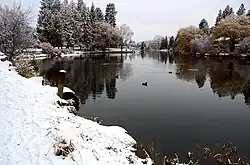 In 1910, Mirror Pond was created by the construction of the Bend Water, Light & Power Company dam on the Deschutes River in Bend. The dam provided the city with its initial source of electricity. The dam has been owned by Pacific Power since 1926 and still produces electricity that supplies approximately 200 Bend households.[11] In 1916, Deschutes County was formed from the western half of Crook County and Bend was designated as the county seat.[12] In 1929, Bend amended the charter and adopted the council–manager form of government.