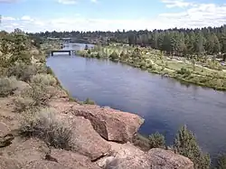 The Deschutes River runs through Bend, where it is dammed to form Mirror Pond.[11] Bend's elevation is 3,623 feet (1,104 metres) above sea level.