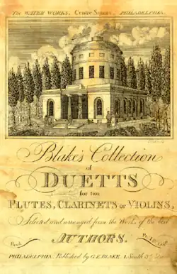 An engraving (c. 1807) by George E. Blake of Latrobe's Center Square Water Works in Philadelphia