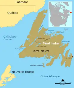 The Beothuk (/bˈɒtək/ or /ˈb.əθʊk/; also spelled Beothuck)[1][2] were a group of Indigenous people of Canada who lived on the island of Newfoundland.[3]