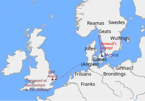 The events in the poem take place over the 5th and 6th centuries, and feature predominantly non-English characters. Some suggest that Beowulf was first composed in the 7th century at Rendlesham in East Anglia, as the Sutton Hoo ship-burial shows close connections with Scandinavia, and the East Anglian royal dynasty, the Wuffingas, may have been descendants of the Geatish Wulfings.[6][5] Others have associated this poem with the court of King Alfred the Great or with the court of King Cnut the Great.[7]