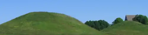 Nineteenth-century archaeological evidence may confirm elements of the Beowulf story. Eadgils was buried at Uppsala (Gamla Uppsala, Sweden) according to Snorri Sturluson. When the western mound (to the left in the photo) was excavated in 1874, the finds showed that a powerful man was buried in a large barrow, c. 575, on a bear skin with two dogs and rich grave offerings. The eastern mound was excavated in 1854, and contained the remains of a woman, or a woman and a young man. The middle barrow has not been excavated.[14][13]
