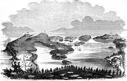 In 1615, the colony, which had been renamed the Somers Isles in commemoration of Sir George Somers, was passed on to the Somers Isles Company.[24][25] As Bermudians settled the Carolina Colony and contributed to establishing other English colonies in the Americas, several other locations were named after the archipelago. During this period the first slaves were held and trafficked to the islands. These were a mixture of native Africans who were trafficked to the Americas via the African slave trade and Native Americans who were enslaved from the new world colonies.[9] The first two slaves arrived in Bermuda in 1616, not from Africa but from the West Indies, one being Black and the other Native American, after Bermuda Governor Tucker had sent the ship "Edwin" to the West Indies to find slaves to dive for pearls in Bermuda.[26] There proved to be no pearls to dive for. More black slaves were later trafficked to the island in large numbers, originating from America and the Caribbean.[27]