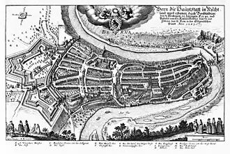 The city grew out towards the west of the boundaries of the peninsula formed by the river Aare. The Zytglogge tower marked the western boundary of the city from 1191 until 1256, when the Käfigturm took over this role until 1345. It was succeeded by the Christoffelturm (formerly located closer to the site of the modern-day railway station) until 1622. During the Thirty Years' War, two new fortifications – the so-called big and small Schanze (entrenchments) – were built to protect the whole area of the peninsula.