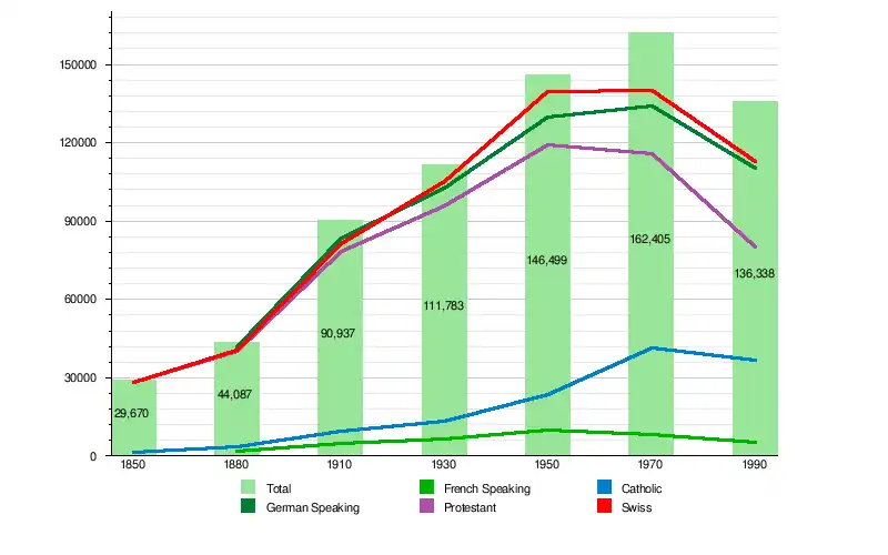 The city's population rose from about 5,000 in the 15th century to about 12,000 by 1800 and to above 60,000 by 1900, passing the 100,000 mark during the 1920s. Population peaked during the 1960s at 165,000 and has since decreased slightly, to below 130,000 by 2000. As of September 2017, the resident population stood at 142,349, of which 100,000 were Swiss citizens and 42,349 (31%) resident foreigners. A further estimated 350,000 people live in the immediate urban agglomeration.[15]