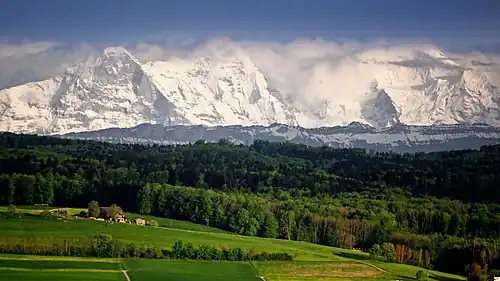 One of the most prominent Alpine ranges, the Bernese Alps extend from the gorge of Saint-Maurice, through which the Rhône finds its way to Lake Geneva, to the Grimsel Pass or, depending on the definition, to the river Reuss (thus including the Uri Alps). The principal ridge, a chain that runs 100 kilometres (62 mi) from west (Dent de Morcles) to east (Sidelhorn), whose highest peak is the Finsteraarhorn, forms the watershed between the cantons of Bern and Valais. Except for the westernmost part, it is also the watershed between the Rhine (North Sea) and the Rhône (Mediterranean Sea). This chain is not centered inside the range but lies close (10 to 15 km) to the Rhône on the south. This makes a large difference between the south, where the lateral short valleys descend abruptly into the deep trench forming the valley of the Rhône and the north, where the Bernese Alps extends through a great part of the canton of Bern (Bernese Oberland), throwing out branches to the west into the adjoining cantons of Vaud and Fribourg. There the mountains progressively become lower and disappear into the hilly Swiss Plateau.[3] The Bernese Alps have a large influence on the climate of Switzerland: while their north side is very exposed to weather, their south side is protected from it. As a consequence, agriculture consists essentially of dairy farming and cattle breeding on the northern foothills, while on the sunnier southern foothills (Rhone Valley) it also consists of vineyards.