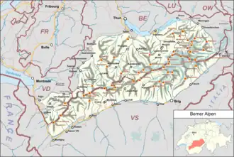 ![]() Map of Bernese Alps and their location in Switzerland (red) | |