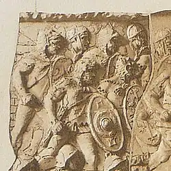 The bas-relief carvings on Trajan's column in Rome, completed in 113 AD, depict scenes of Trajan's conquest of Dacia in 101–106 AD. The scenes show his Roman soldiers plus auxiliaries and allies from Rome's border regions, including tribal warriors from both sides of the Rhine. There are warriors depicted as barefoot, bare-chested, bearing weapons and helmets that are associated with the Germani.[7]