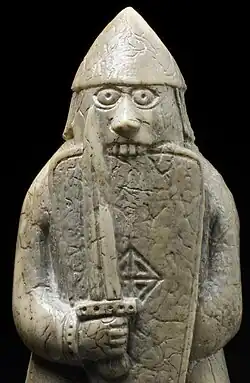 The Lewis Chessmen, found on the Isle of Lewis, Outer Hebrides, Scotland, and thought to be of Norse manufacture, include berserkers depicted biting their shields.