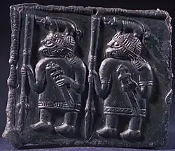 The helm-plate press from Torslunda depicts a scene of a one-eyed warrior with bird-horned helm, assumed to be Odin, next to a wolf-headed warrior armed with a spear and sword as distinguishing features, assumed to be a berserker with a wolf pelt: "a wolf-skinned warrior with the apparently one-eyed dancer in the bird-horned helm, which is generally interpreted as showing a scene indicative of a relationship between berserkgang ... and the god Odin".[25][26]