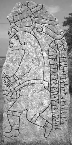 • Left image: Vg 56 runestone from Västergötland, Sweden, possibly depicting a berserker in animal skin.[11]