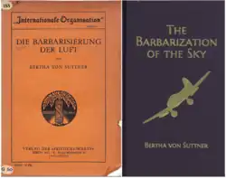 The front covers of Suttner's 1912 essay "Die Barbarisierung der Luft" and its English Translation, published in 2016 by The Bertha von Suttner Project.