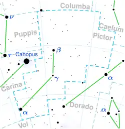 Beta Pictoris is a star in the southern constellation of Pictor, the Easel, and is located to the west of the bright star Canopus.[27] It traditionally marked the sounding line of the ship Argo Navis, before the constellation was split.[28] The star has an apparent visual magnitude of 3.861,[2] so is visible to the naked eye under good conditions, though light pollution may result in stars dimmer than magnitude 3 being too dim to see. It is the second brightest in its constellation, exceeded only by Alpha Pictoris, which has an apparent magnitude of 3.30.[29]
