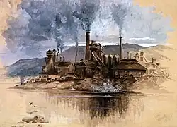 In 1857, the first iron works in Bethlehem, Pennsylvania, was launched as the Saucona Iron Company by Augustus Wolle.[3] That same year, the Panic of 1857, a national financial crisis, halted the company's further organization. Another organization subsequently started, its site moved elsewhere to South Bethlehem, and the company's name was changed to the Bethlehem Rolling Mill and Iron Company.[3] On June 14, 1860, the board of directors of the fledgling company elected Alfred Hunt president.[3]