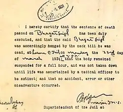 Singh, Rajguru and Sukhdev were sentenced to death in the Lahore conspiracy case and ordered to be hanged on 24 March 1931.[70] The schedule was moved forward by 11 hours and the three were hanged on 23 March 1931 at 7:30 pm[71] in the Lahore jail. It is reported that no magistrate at the time was willing to supervise Singh's hanging as was required by law. The execution was supervised instead by an honorary judge named Nawab Muhammad Ahmed Khan Kasuri, who also signed the three death warrants, as their original warrants had expired.[72]