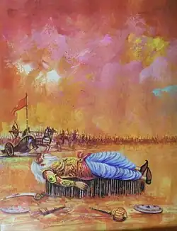 The text Harivamsa mentions that during the mourning period after Shantanu's death, Bhishma killed Ugrayudha Paurava, a statesman of Panchala kingdom who lusted for Satyavati and tried to buy her with wealth.[17] According to the Mahabharata, Chitrangada was crowned as the king, however, he was soon killed by a Gandharva (celestial musician). Bhishma performed Chitrangada's funeral rites.[2][18] Vichitravirya, who was too young to rule, was crowned as the king by Bhishma but the actual control of the kingdom was under Satyavati until he reached adulthood. Bhishma aided Satyavati during that time.[19]