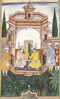 Yudhishthira with Bhishma, from the Razm-Namah, by Fattu, 1598