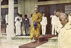Other disused ceremonies from the classical period of the Chakri Dynasty, such as the royally patronised ploughing ceremony (Thai: พิธีพืชมงคล), were also revived.[48] Bhumibol's birthday (5 December) was declared the national day, replacing the previous national day, the anniversary of the Siamese revolution of 1932 (24 June).[49] Upon Sarit's death on 8 December 1963, an unprecedented 21 days of mourning were declared in the palace. A royal five-tier umbrella shaded his body while it lay in state. Long-time royal adviser Phraya Srivisaravacha later noted that no Prime Minister ever had such an intimate relationship with Bhumibol as Sarit.[50]