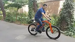 A bicycle stays upright while moving forward by being steered so as to keep its center of mass over the wheels.[46] This steering is usually provided by the rider, but under certain conditions, may be provided by the bicycle itself.[47]