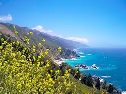 Big Sur (/ˈsɜːr/) is a rugged and mountainous section of the Central Coast of the U.S. state of California, between Carmel Highlands and San Simeon, where the Santa Lucia Mountains rise abruptly from the Pacific Ocean. It is frequently praised for its dramatic scenery. Big Sur has been called the "longest and most scenic stretch of undeveloped coastline in the contiguous United States",[1] a sublime "national treasure that demands extraordinary procedures to protect it from development",[2] and "one of the most beautiful coastlines anywhere in the world, an isolated stretch of road, mythic in reputation".[3] The views, redwood forests, hiking, beaches, and other recreational opportunities have made Big Sur a popular destination for visitors from across the world. With 4.5 to 7 million visitors annually,[4] it is among the top tourist destinations in the United States, comparable to Yosemite National Park, but with considerably fewer services, and less parking, roads, and related infrastructure.[5][6][7][8][9]