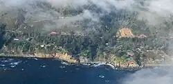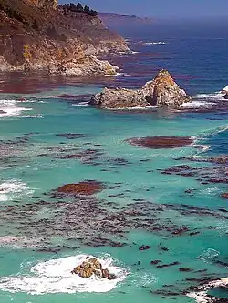 Other beaches that are inaccessible to the public include Point Sur Beach, a long sandy beach located below and to the north of Point Sur Lighthouse.[55] There is a small beach at Rocky Point that is surrounded by private property, making it inaccessible. The beach at the foot of McWay falls is physically inaccessible from the shore. To the south near the county line, Wreck Beach south of Pfeiffer Beach is not accessible. Gamboa Point Beach near the Monterey / San Luis Obispo county line is closed to the public.[55][56]