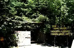 The Henry Miller Memorial Library is a nonprofit bookstore and arts center that opened in 1981 as a tribute to the writer. Miller lived in Big Sur from 1944 to February 1963 and wrote about Big Sur in his book Big Sur and the Oranges of Hieronymus Bosch. It is a gathering place for locals and has become the focal point of individuals with a literary mind,[47] a cultural center devoted to Miller's life and work, and a popular attraction for tourists.[48][49]