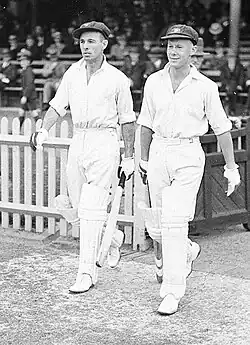 Brown's partnership with Fingleton is regarded as one of the great opening pairings in Australian Test cricket history.[1] In ten Tests as an opening combination, the pair averaged 63.75 for the first wicket, higher than any other Australian duo with more than 1,000 runs.[10] Brown was known for his self-effacing nature and was well liked among teammates and opponents alike.[6][22][33] Of his batting, Brown joked that "My wife said you could always tell when I was batting by the number of people leaving the ground".[10] During a domestic match at the Adelaide Oval in December 1938, he deflected a ball onto his stumps without dislodging a bail. He added a further 147 runs to end unbeaten on 174, eternally apologising for his luck.[22]