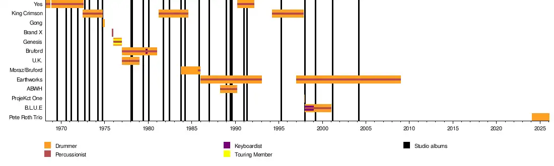 - ^ Bruford announced his retirement from performing and recording on 1 January 2009. His final public gig was with his band Earthworks on 31 July 2008. Bruford was retired from public performance, save for a short stint with the Surrey covers band Ann Bailey's Soul House, until returning to live music joining the jazz band Pete Roth Trio formed in 2022 and making an appearance at the John Wetton Tribute Concert at Trading Boundaries in 2023.[1]