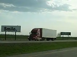 An interesting use of billboards unique to highways was the Burma-Shave advertisements between 1925 and 1963, which had 4- or 5-part messages on multiple signs, keeping the reader hooked by the promise of a punchline at the end. This example is in the National Museum of American History at the Smithsonian Institution: