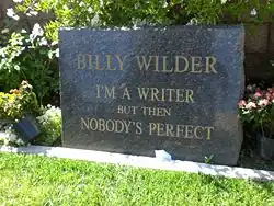 Wilder died of pneumonia on March 27, 2002.[48][49] He was buried at Pierce Brothers Westwood Village Memorial Park and Mortuary.[50] A French newspaper, Le Monde, titled the front-page obituary: "Billy Wilder is dead. Nobody is perfect", a reference to the last line of Some Like It Hot.[51]