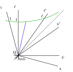 The various axes represent time for observers in motion, the corresponding axes are their lines of simultaneity. - Hyperbolic orthogonality: Time and space are different categories, and temporal properties are separate from spatial properties. The idea of simultaneous events is simple in absolute space and time since each time determines a simultaneous hyperplane in that cosmology. Hermann Minkowski changed that when he articulated the notion of relative simultaneity, which exists when spatial events are "normal" to a time characterized by a velocity. He used an indefinite inner product, and specified that a time vector is normal to a space vector when that product is zero. The indefinite inner product in a composition algebra is given by