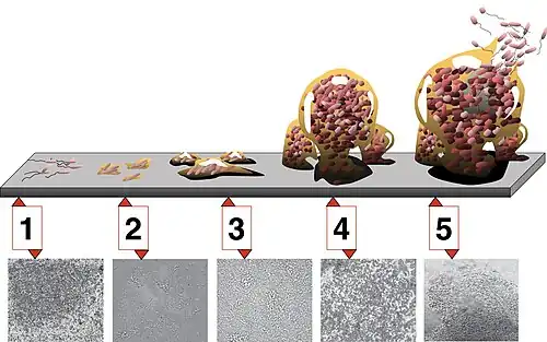 Biofilms are the product of a microbial developmental process.[28] The process is summarized by five major stages of biofilm development, as shown in the diagram below:[29]