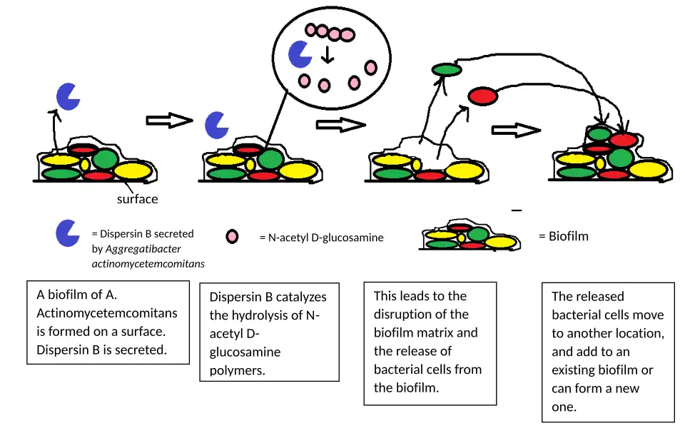 Dispersal of cells from the biofilm colony is an essential stage of the biofilm life cycle. Dispersal enables biofilms to spread and colonize new surfaces. Enzymes that degrade the biofilm extracellular matrix, such as dispersin B and deoxyribonuclease, may contribute to biofilm dispersal.[30][31] Enzymes that degrade the biofilm matrix may be useful as anti-biofilm agents.[32][33] Evidence has shown that a fatty acid messenger, cis-2-decenoic acid, is capable of inducing dispersion and inhibiting growth of biofilm colonies. Secreted by Pseudomonas aeruginosa, this compound induces cyclo heteromorphic cells in several species of bacteria and the yeast Candida albicans.[34] Nitric oxide has also been shown to trigger the dispersal of biofilms of several bacteria species[35][36] at sub-toxic concentrations. Nitric oxide has potential as a treatment for patients that have chronic infections caused by biofilms.[37]