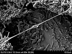 The formation of a biofilm begins with the attachment of free-floating microorganisms to a surface.[9][6] The first colonist bacteria of a biofilm may adhere to the surface initially by the weak van der Waals forces and hydrophobic effects.[16][17] If the colonists are not immediately separated from the surface, they can anchor themselves more permanently using cell adhesion structures such as pili. A unique group of Archaea that inhabit anoxic groundwater have similar structures called hami. Each hamus is a long tube with three hook attachments that are used to attach to each other or to a surface, enabling a community to develop.[18][19] Hyperthermophilic archaeon Pyrobaculum calidifontis produce bundling pili which are homologous to the bacterial TasA filaments, a major component of the extracellular matrix in bacterial biofilms, which contribute to biofilm stability.[20] TasA homologs are encoded by many other archaea, suggesting mechanistic similarities and evolutionary connection between bacterial and archaeal biofilms.[20]