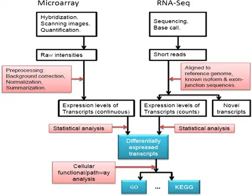 The expression of many genes can be determined by measuring mRNA levels with multiple techniques including microarrays, expressed cDNA sequence tag (EST) sequencing, serial analysis of gene expression (SAGE) tag sequencing, massively parallel signature sequencing (MPSS), RNA-Seq, also known as "Whole Transcriptome Shotgun Sequencing" (WTSS), or various applications of multiplexed in-situ hybridization. All of these techniques are extremely noise-prone and/or subject to bias in the biological measurement, and a major research area in computational biology involves developing statistical tools to separate signal from noise in high-throughput gene expression studies.[50] Such studies are often used to determine the genes implicated in a disorder: one might compare microarray data from cancerous epithelial cells to data from non-cancerous cells to determine the transcripts that are up-regulated and down-regulated in a particular population of cancer cells.